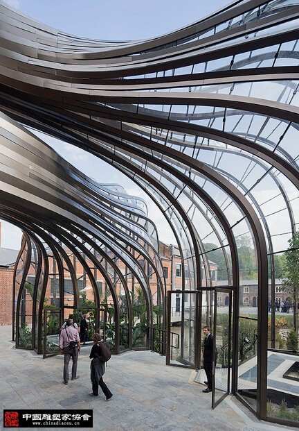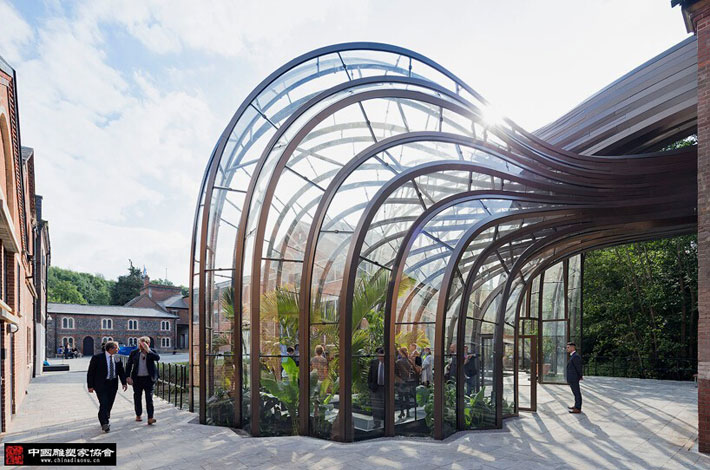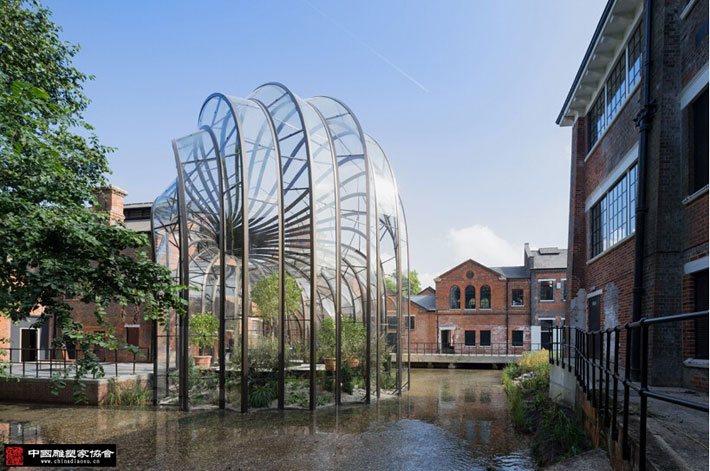 英格兰乡村的中心地带, 著名英国设计师托马斯·海德威克 (thomas heatherwick )为杜松子酒制造商bombay sapphire设计的一个 蒸馏酒厂竣工了。在1718年,henryportal获得这片土地并且开始为银行生产钞票之前,此地最初的功能是玉米磨坊。在接下来的200年里,一片由砖石建筑构成的网络逐渐蔓延开来,这些不协调的建筑导致了一个浑浊不堪河网。因此,heather wick的团队决定在规划这片环绕水路的土地时,将中央庭院置于这个项目的心脏部位。除了保护当地野生动物和拆迁九处结构上的劣质增建,改造还涉及了位于原址23处历史建筑的修复工作,这个改造被设计团队称为“选择性拆迁”的工作。为了使河水恢复清澈,河岸也被重新改造和拓宽。 这个重建计划的焦点集中在两个植物玻璃温室:一个为热带气候而另一个地中海气候,这些玻璃温室种植着在杜松子酒生产过程中重要的十种植物。这个精密设计的结构由893块单独精心设计的构件和超过1公里的被外包青铜的不锈钢框架支撑而成。