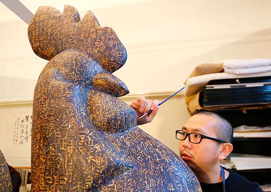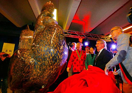 据悉,这尊高2米多的雕塑作品由旅比画家张文海设计、装饰完成。张文海受瓦隆大区的委托,在鸡年为纪念中比建交45周年制作了上述雕塑,并将之命名为“骄子”。
