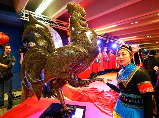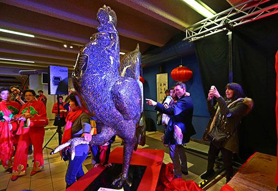 布鲁塞尔1月29日在比利时南部小城迪南市举行的庆祝中国春节招待会上,比利时瓦隆大区政府将一尊象征瓦隆大区的大型“雄鸡”雕塑赠送给中国驻比利时使馆,以向中国“鸡年”致意。