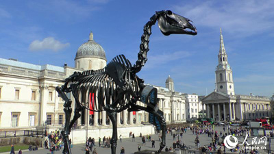 伦敦市长鲍里斯·约翰逊当地时间今日上午揭幕了特拉法加广场第四基柱的最新作品,由德国艺术家汉斯·哈克设计的雕塑马(Gift Horse)。该雕塑将在未来18个月伫立在特拉法加广场上,这是第十件展示于第四基柱的艺术品。