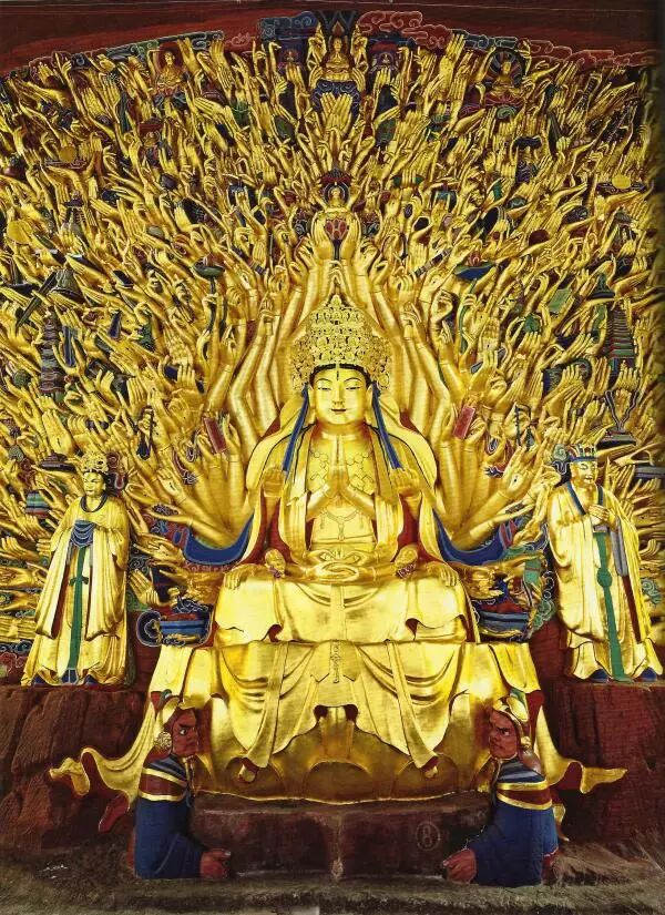 但不知为何,“重贴金箔”这一设想如此根深蒂固,乃至不惜要舍弃“修旧如旧”这一基本修复理念,于是一系列悲剧接踵而来。首先,用粘合性更好的天然大漆代替“牛较”做粘接材料,砂石观音通体被刷了四层黑色大漆和一遍红色大漆,观音的原皮壳、包浆被全部覆盖。然后,全部改贴亮闪闪的新金箔,据说有一百万张,以至于金碧辉煌。最后,重贴的金箔表面必须重上彩妆。彩绘组苏东黎说“起初,我们看到的千手观音灰土土的,很不好看,而且色彩饱和度很低”。确实,原来的色彩只残存20%,重上彩后当然是100%,靓丽如新了。