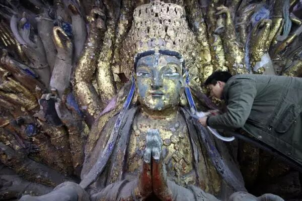 2013年3月4日,重庆市大足区宝顶山千手观音底层修复现场,文物修复人员正在清除造像表面积尘。 CFP 资料